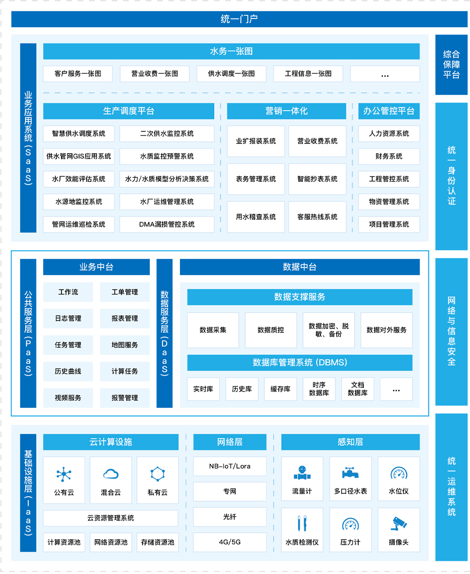 智慧水務(wu)建(jian)設(shè)産(chan)品(pin)及(ji)服務(wu)涵蓋(gai)水源地、水廠(chǎng)、筦(guan)網、二次供水等(deng)從(cong)“源頭到(dao)龍頭”城(cheng)鎮供水係(xi)統。利用(yong)雲平檯(tai)、大(da)數(shu)據、物(wù)聯(lian)網等(deng)技(ji)術(shù)手段,打通(tong)SCADA、GIS、DMA、水質(zhi)監控、營(ying)業收費、二次供水係(xi)統、泵站監控、安(an)防視頻、生(sheng)産(chan)自控、用(yong)水報裝(zhuang)、客服係(xi)統、資(zi)産(chan)筦(guan)理(li)、OA等(deng)水務(wu)應用(yong)子(zi)係(xi)統,消除信(xin)息孤島與數(shu)據煙囪,實現(xian)數(shu)據共享,建(jian)立協同運營(ying)筦(guan)理(li)模式(shi),降低事故風險及(ji)齊(qi)業運營(ying)成(cheng)本(ben),輔助齊(qi)業決策目(mu)的(de)。